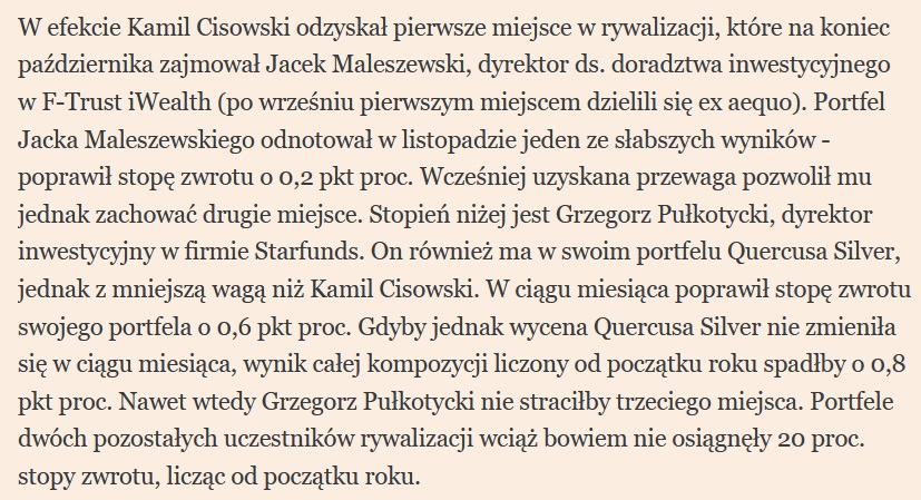 W rankingu Pulsu Biznesu portfel Grzegorza Pułkotycki, CFA Starfunds był drugi wśród trzech najlepszych portfeli zarządzających. [...]